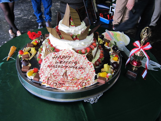 ブラブラと見て回りガレージに戻ると・・・そこには巨大なケーキが!十勝レーシングスクールの敏腕メカニック小谷さんが「パティスリーありがとう」さんにお願いしていたそうで、今野氏の誘いはサプライズの準備をするためだったのです。