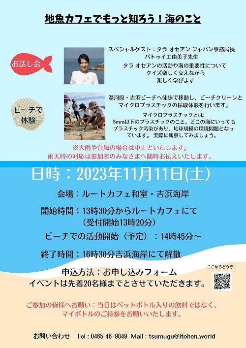 神奈川県の湯河原にある地魚カフェ、Root Cafeさんとのコラボレーションで環境教育イベントを行うこととなりましたのでご案内いたします。