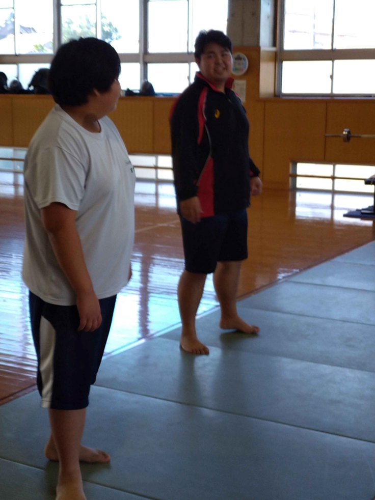 土俵がないため、柔道場にチョークで〇を書いての稽古?練習?