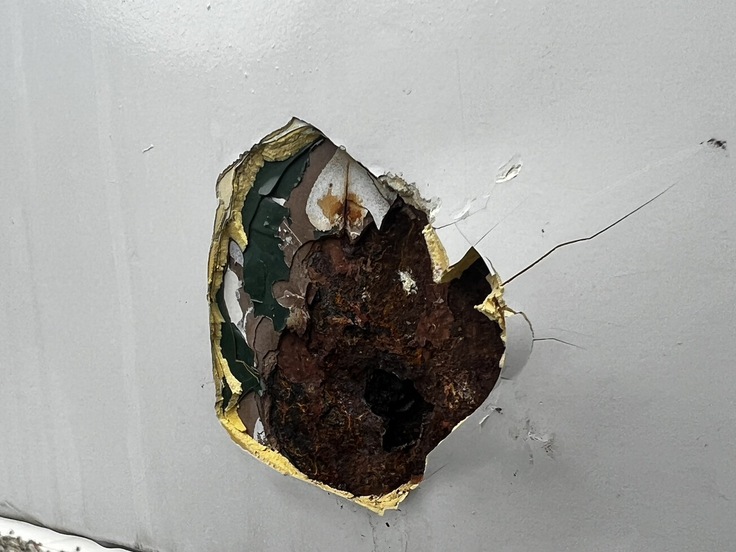 ドア開閉で浮いてた塗装が開閉に支障して剥がれてしまいました。 また外板の腐食も激しく穴が空いている箇所もあるため張り替えを要します。