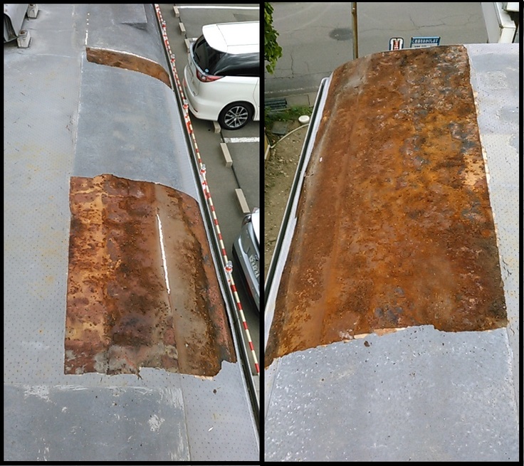 車両を覆う屋根を設置したため多少は軽減できましたが根本的な解決には屋根材の張替、屋根鋼板の修繕を要します。