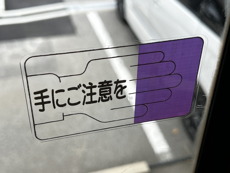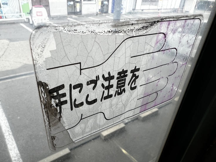 各扉には「手にご注意を」というステッカーが貼られています。これも経年劣化によりボロボロな状態です。