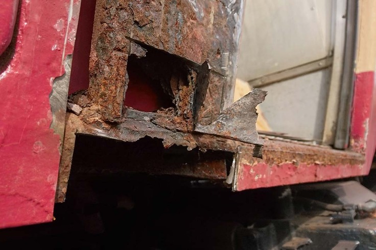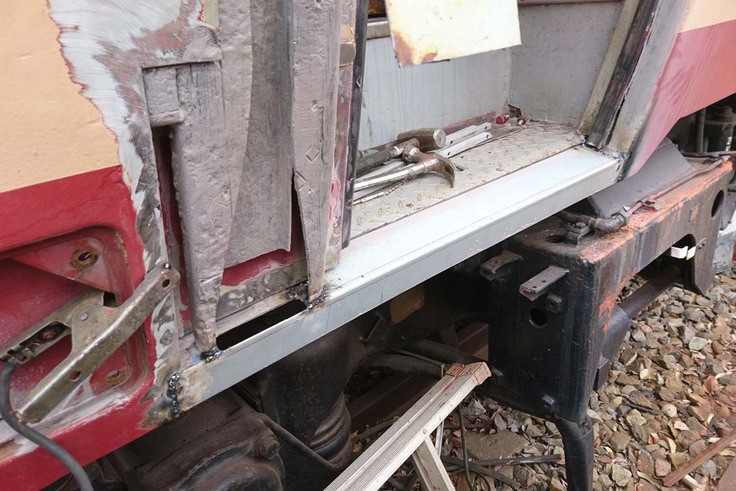 側面と客用乗降扉部分は2021年までに再修理等で完全に劣化防止対策をしました。鉄板の重ね張りはかえって内側の鉄板膨張を促してしまい、車体にストレスを与えていました。屋根でも劣化部分の鉄板は重ね張りせず、丁寧に切除して再溶接します。