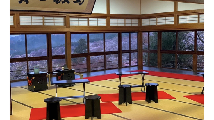 For many years, this building has served as the final lodging point for Shugendo practitioners departing Yoshino for Mount Omine and the “Practice of Traversing the Distant Peaks” (Okugake Shugyo). In addition, the hall is used for esoteric Buddhist transmission and initiation ceremonies, Sutra-copying and meditation retreats, talks and lectures, and all kinds of workshops, artistic performances, and other events.