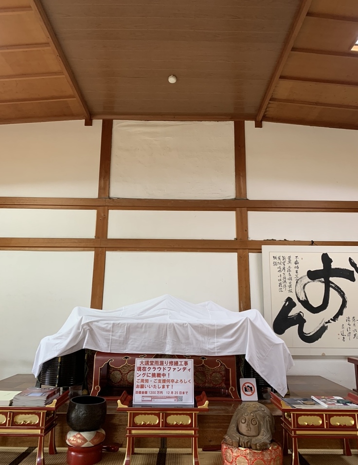 大講堂ご本尊「聖観音」さまと「役行者 母公」さまは、大講堂の工事が終わる来年春まで、聖天堂と宝聚堂へ一時ご遷座頂いております。祭壇の真上の白壁、ならびに天井にも雨漏りの被害があり、内装工事もこの度実施致します。一日も早く、ご本尊様2柱が大講堂にお戻りになられることを、日々切に願っております。