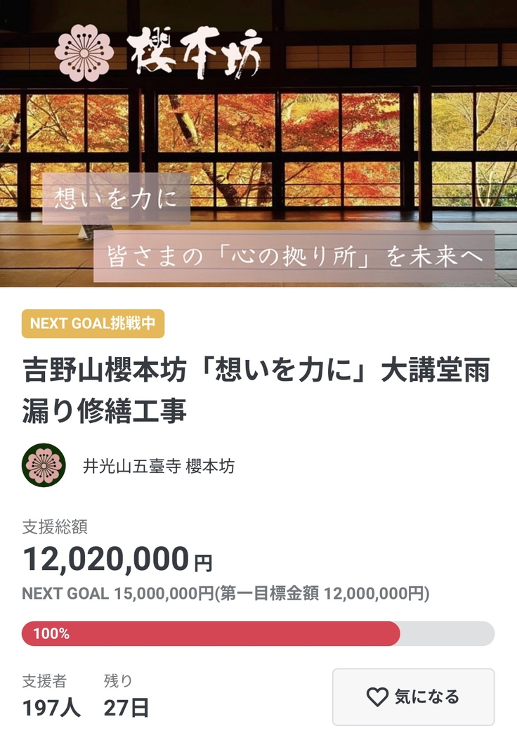 この度は、櫻本坊へ多大なる応援のお気持ちと、心強いお言葉をいただきまして、誠にありがとうございます。11月1日に開始いたしました本プロジェクトは、大変ありがたいことに、11月28日に、第一目標金額であった1200万円を達成させていただけました。