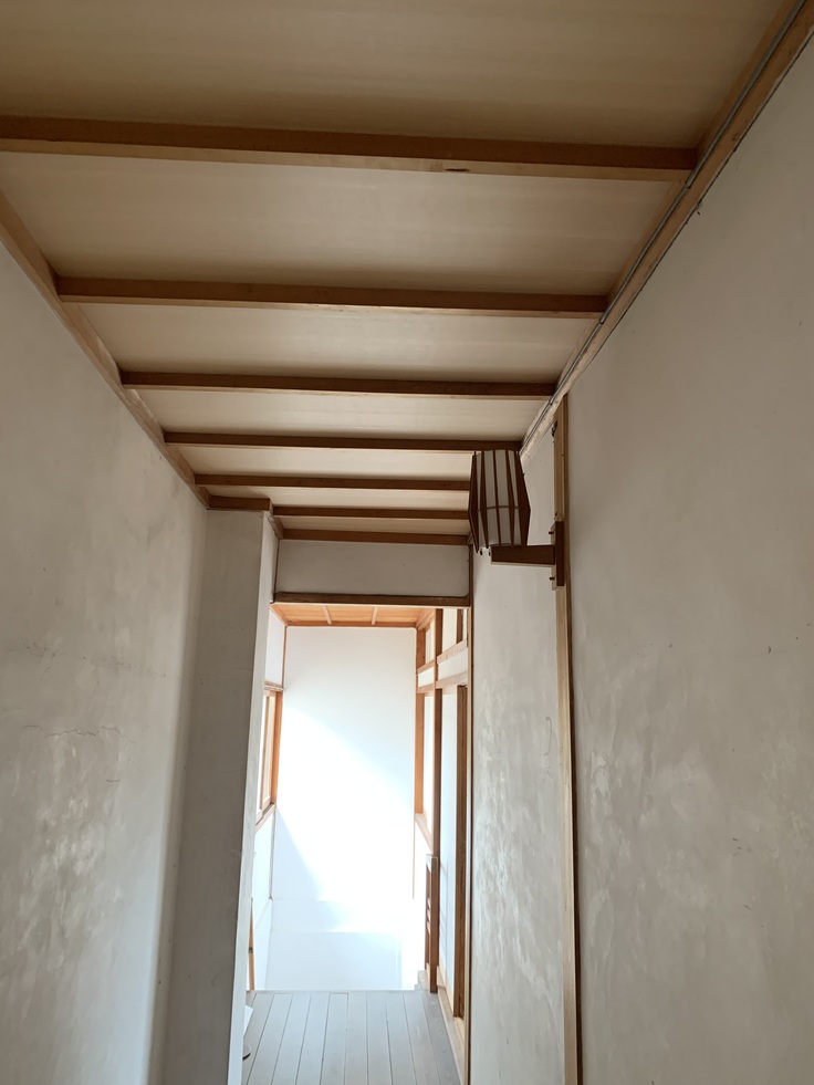 大講堂 周囲廊下天井(参拝者お手洗い 階下へ向かう廊下)で、最も雨漏り被害が大きかった箇所の、内装工事が終了しましたことを、ご報告致します。