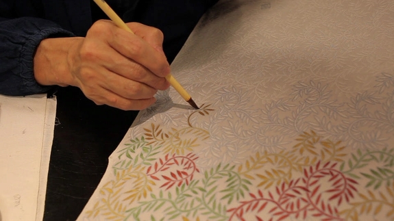 東京の伝統芸術家により一つ一つ絵付けをされる絹