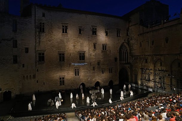 かつて世界的な権威の象徴であり、800年の時の流れを刻み込んだ巨大な壁面に囲まれた法王庁中庭での『アンティゴネ』(2017年 SPAC 宮城聰演出)