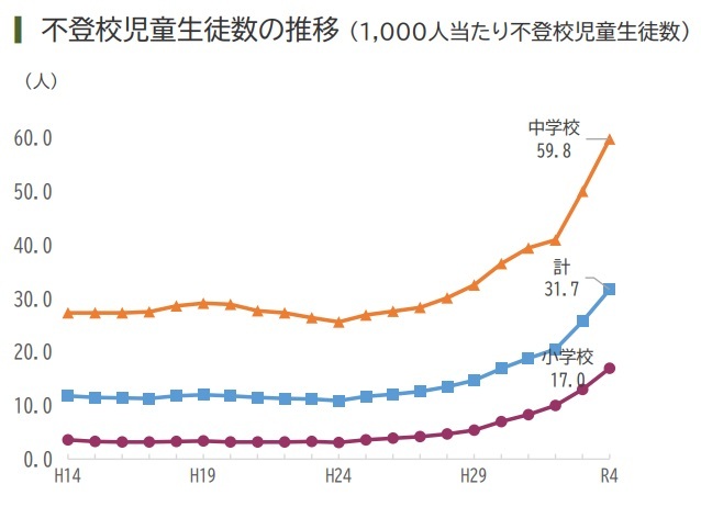 児童生徒1,000人当たりの不登校児童生徒数は31.7人(前年度25.7人)。(令和四年度)