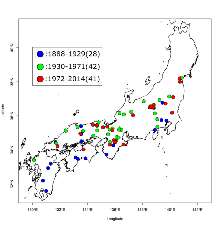 いろいろな植物標本庫に収蔵されているマダイオウの標本が,いつどこで採取されたかを調べた例があります(Uemura et al. 2022, Nordic Journal of Botany 2022: e03543).それによると,マダイオウは戦前から1970年頃までは,東北地方から鹿児島までの広い範囲で採取されていましたが,ここ50年ほどの標本は採取された場所が限定的であることが分かります.