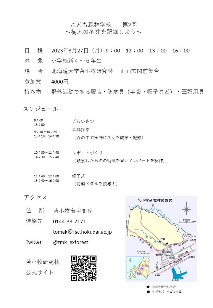 春休み期間中の3/27の午前と、午後の2回で小学校高学年生を対象とした、樹木の冬芽と樹皮の観察会を実施します。樹木に詳しい職員が同行して、木の見方、自然の見方をレクチャーします。