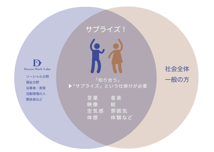 Liveや展示、ワークショップといった、障がいのある人やその家族、福祉分野の人々と、社会全体が混ざり合う “サプライズ” の仕掛けにより、お互いの違うところと同じところを知り、理解するきっかけになります。