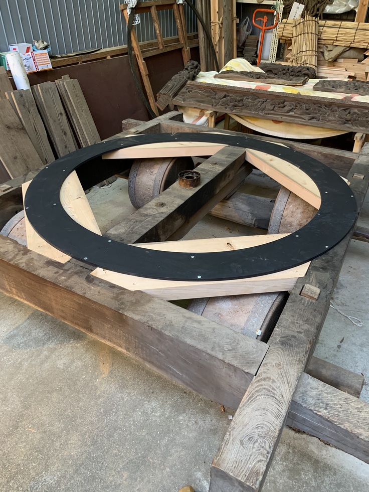 台車部分はすでに完成していました。奥に見える黒い丸いのが見えますがこれが今まで台車に設置されていたもので、直径は変わりませんが幅が約3倍くらいになったので、お囃子をする踊り場部分はかなり安定するのではと思います。