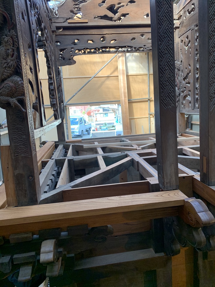 年内には踊り場部分を再度台車に乗せて、これからは彫り物とかの修繕を行うとのことです。
