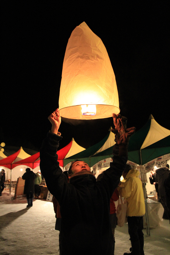 昨年の雪まつりでは、試行的に少しスカイランタンを飛ばしたところ、ゆっくりとおよそ100メートルの上空まで飛翔し、たいへん幻想的で、会場が一体となり涙が出るほど感動的な光景でした。