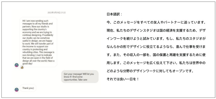 内容は「仕事を続けて国を助けたい」というものでした。彼は16名のデザイナーを抱えるデザイン事務所[SVOYA studio( スボヤスタジオ、所在地:ドニプロ、ウクライナ)]の代表Denis(デニス)で、戦禍においてもデザインをすることで得られる収益を国のために使うというのです。