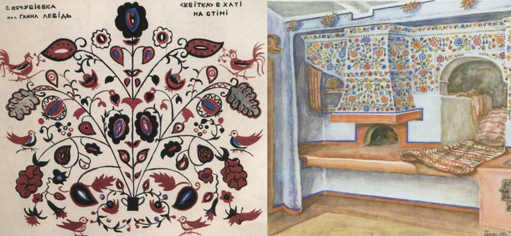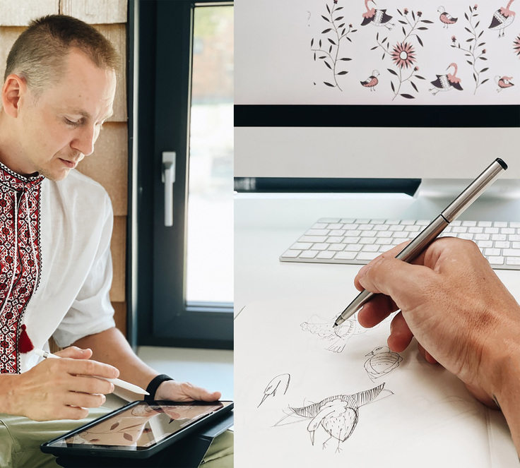 モチーフはウクライナの家の壁にも描かれる伝統的な民族画で、その柄として頻繁に使用される世界樹と鳥の絵です。人が祖先から親、子供、孫と繋がっていくように木は生命が循環する象徴で、鳥はその木を守る神の使いとして、上部や根元に対称形で2つずつ描かれます。このモチーフを選ぶことにより、普段通りの穏やかな生活を守りたいという願いを込めました。