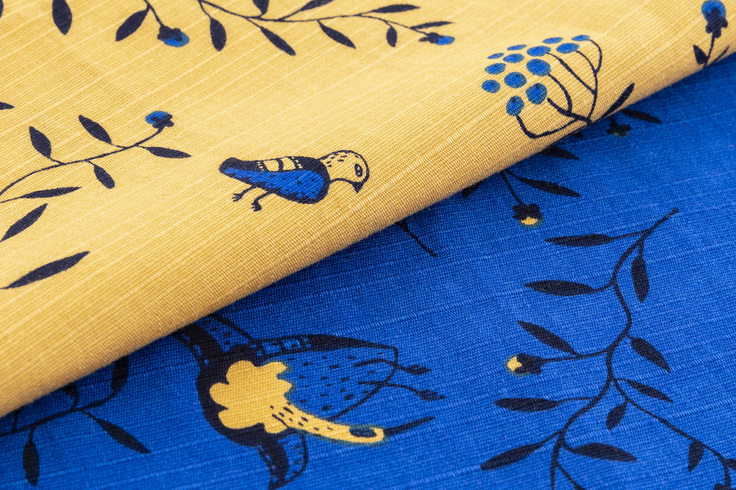 モチーフにしているのはウクライナの伝統的な民族画で、植物と鳥を総柄でバランス良く配置したオリジナルのグラフィックを版から作成し、京都の職人による手捺染(てなせん)で表現しました。
