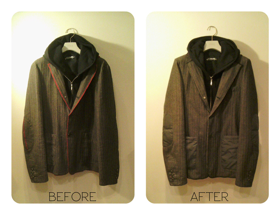 肩幅詰め、身幅詰め、袖幅詰めを行って、ダウンジャケットの生地で胸のウェルトポケット(今回はフェイク)エルボーパッチ、腰のパッチポケットを付け、赤いロックミシンは黒に変更。