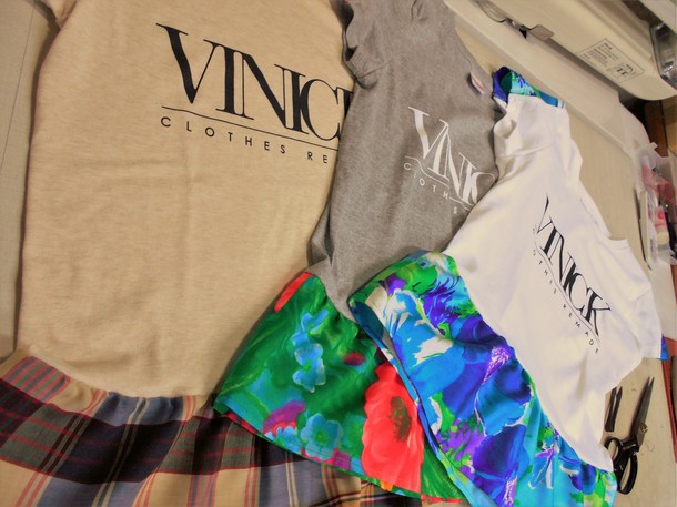 また、現在、今週末に「DESIGN FESTA VOL.43」というイベント出展を控えているため、皆様にリターンとしてお送りさせていただいたVINICKロゴTシャツと、ご支援いただいたヴィンテージウエアの残布を利用して、オリジナルリメイクTシャツを制作中です。