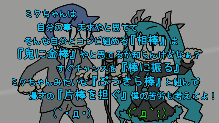 ボーカロイドの漫才大会、『VM-1グランプリ』運営の目つき悪いPです。 普段は動画配信サイト、ニコニコ動画でボーカロイドの動画を作っています。