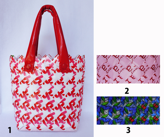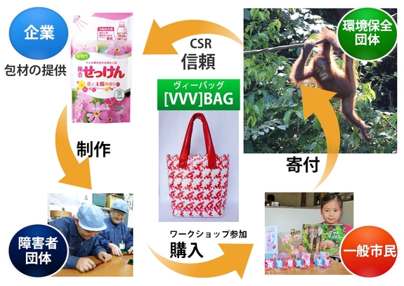 企業で廃棄されるパッケージフィルムを利用して、障がい者事業所で加工し、みんなで「かわいいバッグ」をつくります。
