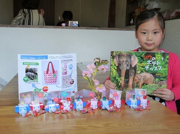(ボルネオゾウを廃材でつくる「チャリティー工作」を開き、子ども達に「ゾウが困っている事」を伝えています。カフェ茶碗にて)