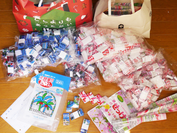 (複合せっけんとヤシノミ洗剤の袋をカットして、パーツを制作。こんなに納品されています。)