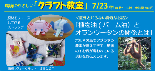 (期間中7/23はヴィークラフトのワークショップを開催し、パーム油と自然保護の話を伝えます)