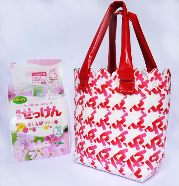 このバッグは、サラヤ株式会社から洗剤の詰め替え用パウチをご提供いただき、私がデザインして障がい者事業所の方と一緒に制作しました。そして、「eco japan cup2013」でライフスタイル部門エコチャレンジ!特別賞をいただきました。