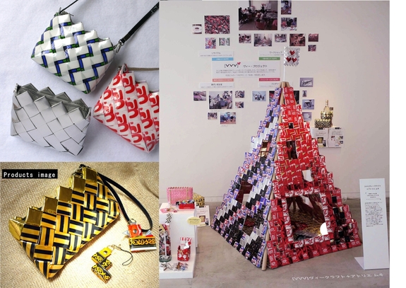 (使用パッケージの商品は、左上:洗剤、左下:ウィンナー、右:仲間で食べたキットカット(2012LIVING & DESIGN展))