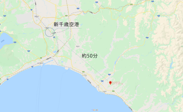 当牧場は、新千歳空港から車で約50分。日高門別ICからも約7分ほどの距離にあります。