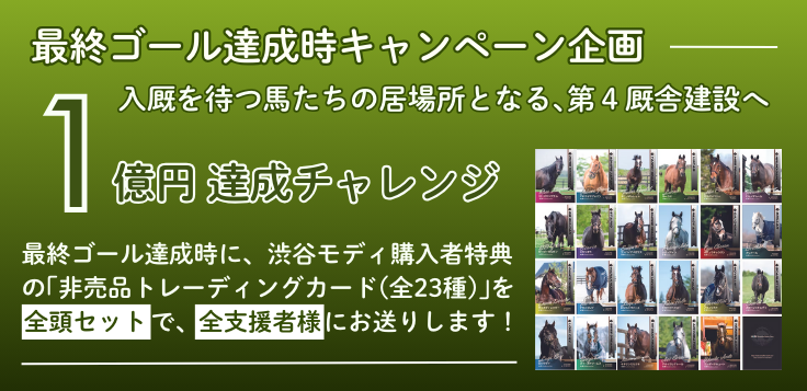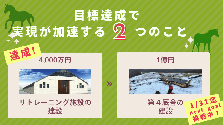 皆様本当にありがとうございます。終盤にして一気に支援をいただいていることに本当に感謝の思いでいっぱいです。残りの募集期間は、短い期間ですが第4厩舎建設のために1億円のネクストゴールを目指します。
