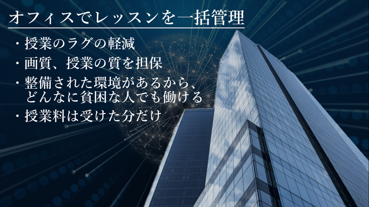 さらに、全授業はビジネスオフィスで統括され、光ファイバーを用いた環境で展開されるため、通信速度のラグや画質等における問題もほとんどありません!