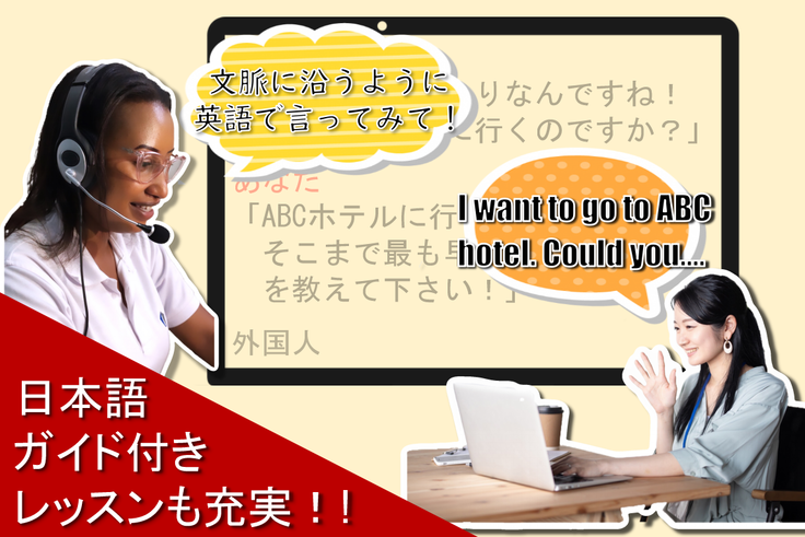 このコースでは、会話の内容が全て日本語で表示されています。それらの日本文を随時、自分なりに英訳して相手とコミュニケーションを取りましょう!本コースでもあらかじめ予習資料が配布されますが、このコースの予習資料には、ほぼ全てのレッスン内容があらかじめ書かれているので、初心者の方でも安心して受講することができます!