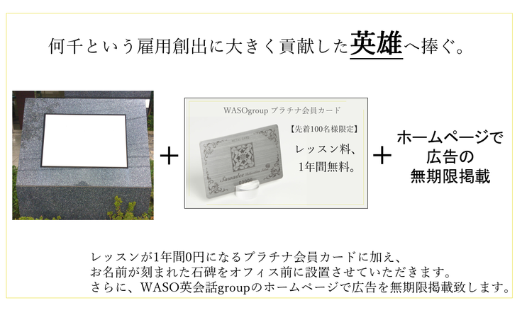 更に、WASOオンライン英会話groupのホームページにて、お名前や企業様の名前をご支援者のご希望に沿って半永久的に(本サービスが終了するまで)掲示させていただきます。
