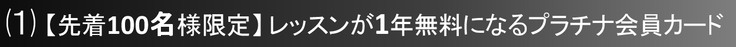 【先着100名様クラウドファンディング限定】で本レッスンが1年間無料になるプラチナ会員カードを提供致します。ご家族であれば誰でもお使いいただけます。カード裏面に記載されている番号をご使用して頂くことで本サービスをご利用いただけます。そのため、カード及び番号の管理は厳重に行ってください。(番号のコピー・乱用を防ぐためレッスンは、ひと月30回までとさせていただきます。また、先月の残り授業回数を次の月に繰り越す事は致しかねます。ご理解とご協力の程、何卒よろしくお願い致します。)※写真はイメージであり、実際のものとは異なります。