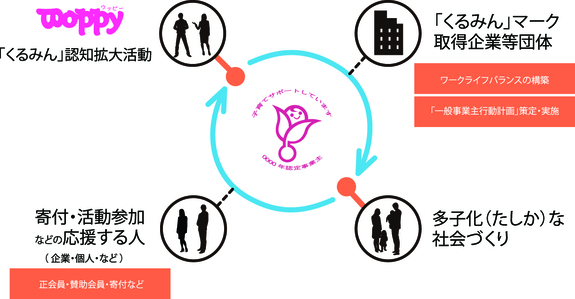 私たちは、下記にあげる活動を通し、世の中にくるみんマークの存在を知ってもらう事でくるみん取得企業のブランディング効果を高め、また、企業等団体がくるみんマークの取得するようサポートする事で少子化対策につなげていきます。