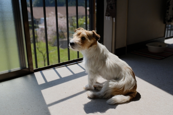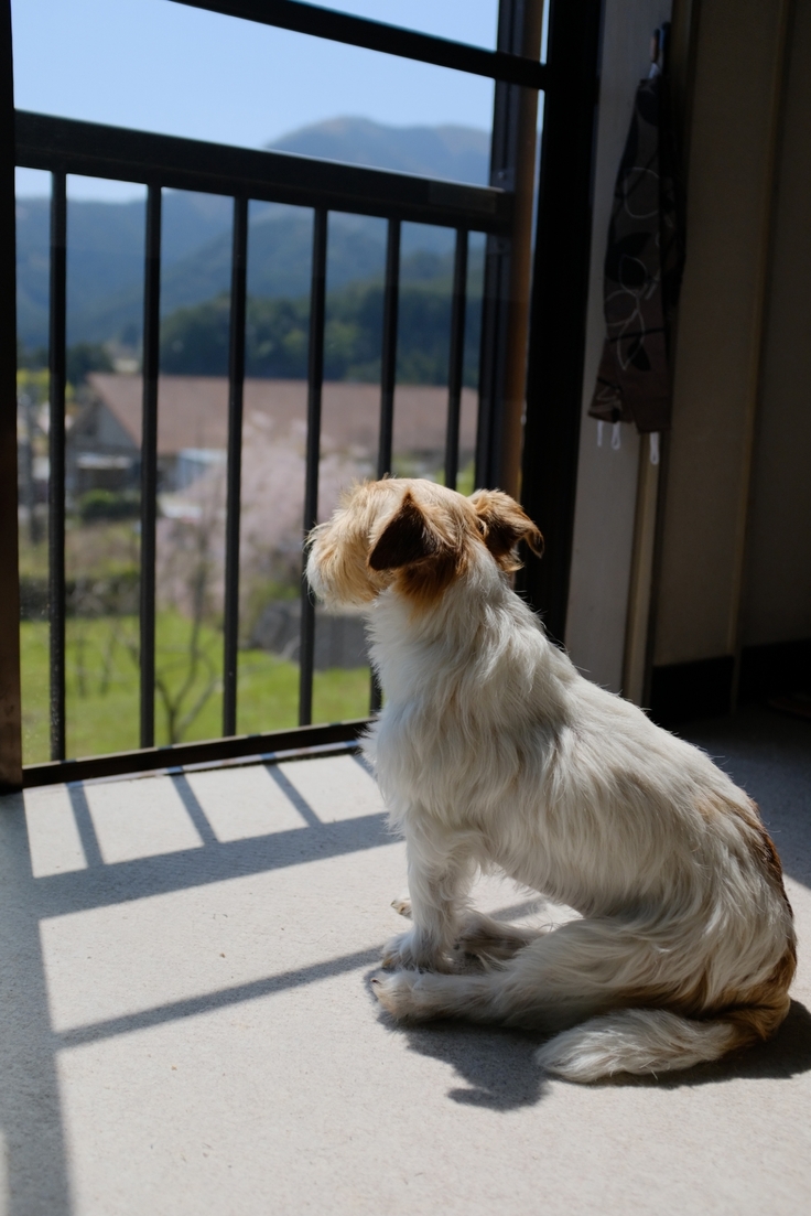 4月2日はゲンキの旅立ちの日。まだ桜が残っていました。その日はワンズ・ラフの通常イベントもあり、いつもどおりお見送り・お迎えの仕事をしてくれました。かなり衰弱が進んでいましたが、近隣からあそびにきている子どもたちを眺めたり、虫の知らせでかけつけてくれた非常勤スタッフのともこさんの声にも応えていました。