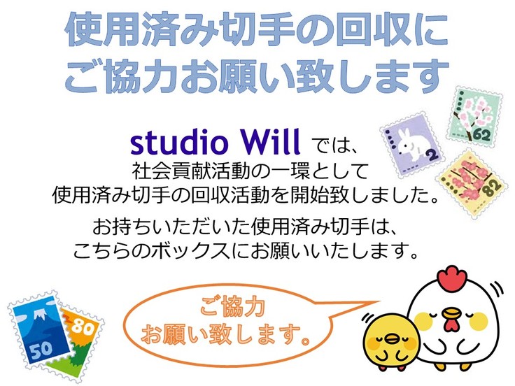 今回、studio Willの事務全般を任されることが決まり、『今までしていた小さな力の活動を、ジムで行い今より少しだけ大きな力にしたい…』と思い、お客様に使用済み切手の回収のご協力をすることにしてみました(*^-^*)