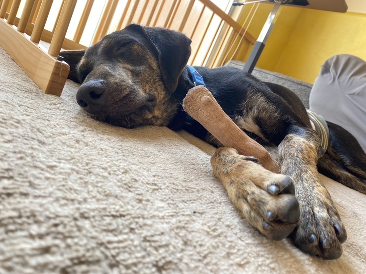 バディくんは、愛護センターから引き取りました。初めて会った時、めちゃくちゃパワフルで、ぴょんぴょん飛びついて、甘噛みを腕にガブガブ。こりゃすごいと2人とも笑ってしまいました。愛護センターの方と話をしていくと、とってもパワフルで元気いっぱい、なかなかセンターで発散させてあげることが難しいとお聞きし、私達もフレンドリーな事自体はハナマルですが、オフを教えてあげないと、手に負えずまた保護犬になってしまうかもしれないと思い、バディくんを引き取りました。連れて帰ると、室内でも大暴れ。ハウスも永遠に吠える。24時間常に大興奮でした。まずは、運動をしてストレス発散を徹底して行い、その後落ち着いて過ごすトレーニングや基礎トレーニングを開始。