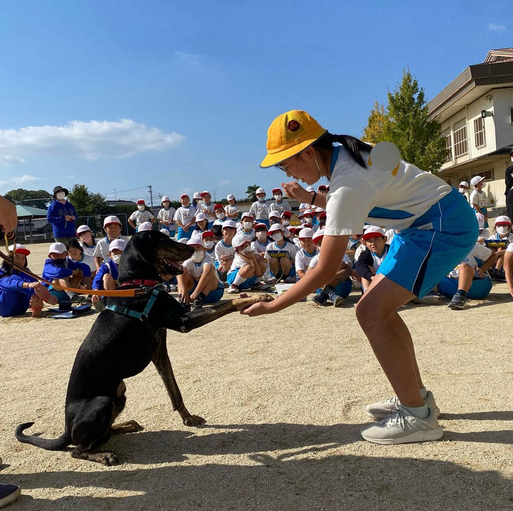 人と何かをすることは大好きなので、動作自体の覚えは早かったですが、落ち着くについては過去1大変なわんこでした。しかし、約半年経った今、彼は教育活動や啓発活動でビシッとトレーニングを披露し、落ち着いてふれあいができ、活動に大大大貢献、なくてはならない存在です。