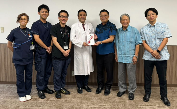 今回のご来院は、クラウドファンディングに関するニュースを見た仲吉取締役の発案だったそうで、井上会長、酒匂社長もお連れいただき、当院の比嘉国基院長、救急科の山内素直部長、立津看護師長、仲里救急救命士らと懇談の機会をいただきました。