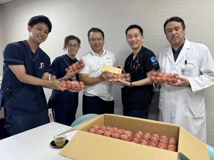 懇談では、諸見里会長と当院、そして当法人の豊崎クリニックとのこれまでのご縁などについてお話しさせていただき、その後、クラウドファンディングへのご支援に関する目録と採れたての卵を頂戴しました。