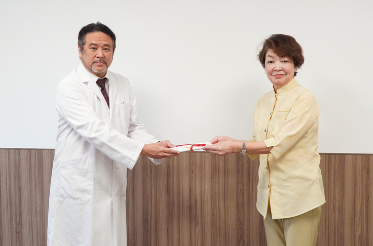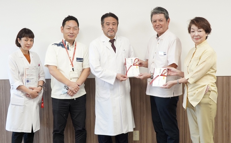 光文堂コミュニケーションズ取締役会長・金城善輝様、代表取締役・外間なるみ様が当院へお越しになり、救急車型ドクターカー導入事業への激励とクラウドファンディングに対する支援金をいただきました。