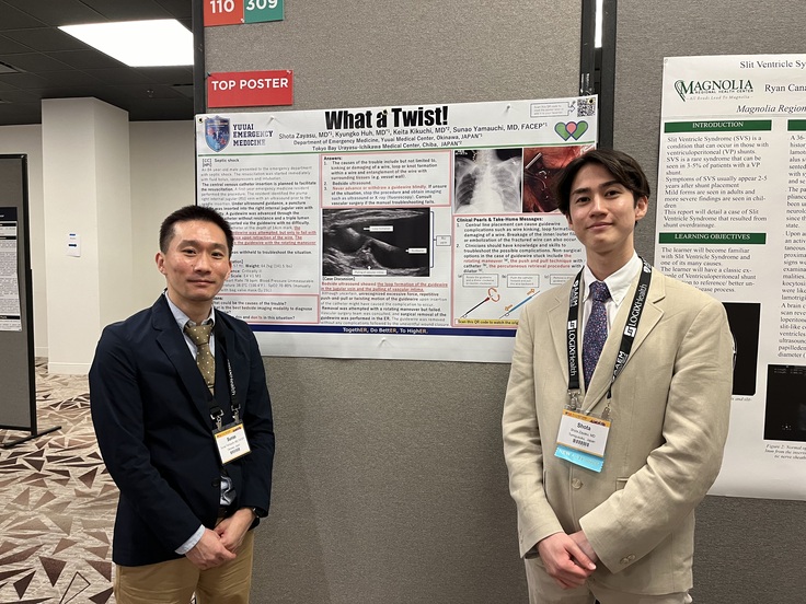 今年4月末にアメリカのテキサス州オースティンで行われた米国の救急医学の学会、AAEM 24 (American Academy of Emergency Medicine)のポスター発表部門で、当院初期研修医の座安 祥汰先生と救急科後期研修医の許 敬高先生 (現 広島市民病院救急科後期研修医)の症例のポスター発表が、なんと全米2位を獲得しました!