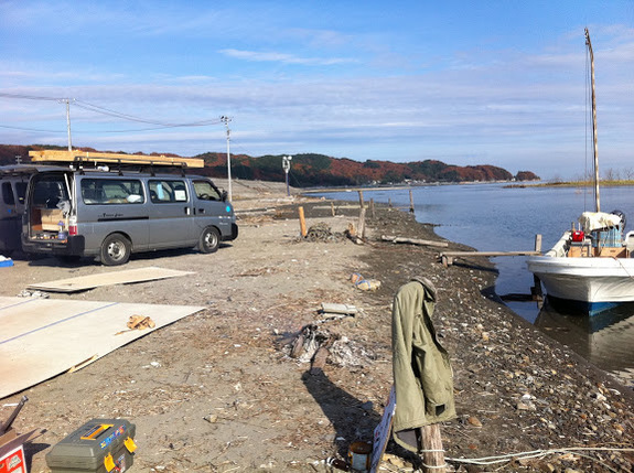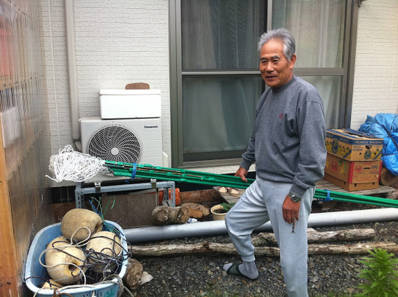 私は山崎さんという漁師さんに出会いました。漁師歴60年、彼は17歳のときから漁師一筋で生きてきました。具体的な倉庫の必要性を書くという面倒な作業の説明の途中で何人もの漁師さんがミーティングから去っていいく中、山崎さんは一言も話さず最後まで残って何を書けば良いのか熱心に聞いて帰られました。後日再び仮設住宅を尋ねると、山崎さんは震えた文字で綺麗に書かれた用紙を渡してくれました。彼の仮の住まいの裏には瓦礫の中から必死に拾ってきた漁具が散乱していました。今まで海の目の前に住んでいて運転免許を持たなくても、リアカーをバイクにつなげて少し走れば漁に出る事ができていた山崎さん。今では仮設住宅から3キロ離れた港までリアカー付きバイクを走らせて漁に出ていると教えてくれました。