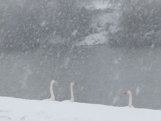 津軽の冬、川辺にハクチョウやカモたちが集う
