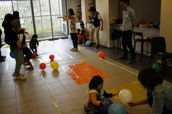 カラフルなテープに風船、子どもたちが楽しみながら学んでいますね。